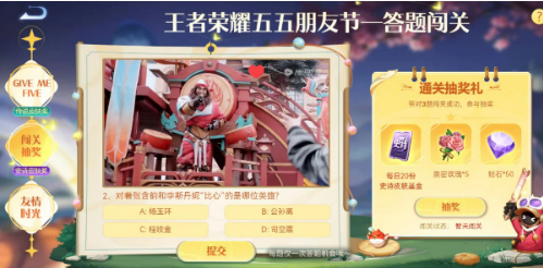 第二题考验角色互动观察力:在官方发布的明星联动视频中,程咬金角色通过标志性的比心动作与两位艺人形成趣味互动。该题目设计巧妙结合了游戏角色特性与跨界合作内容,正确选择需要玩家仔细观看过场动画细节。